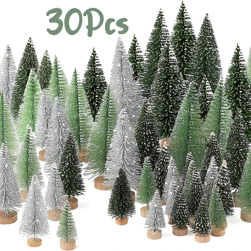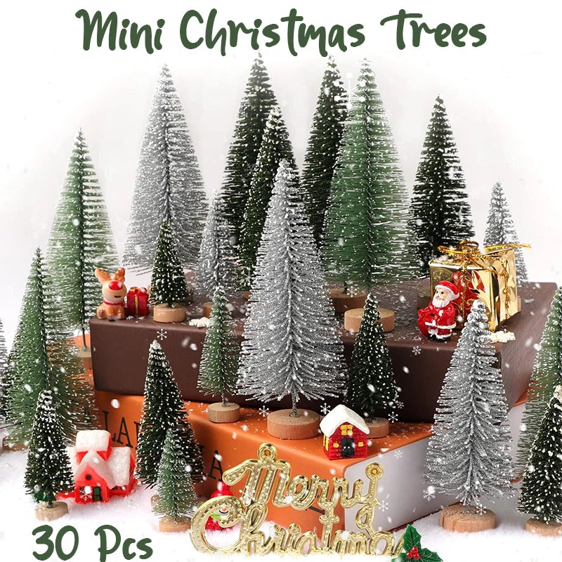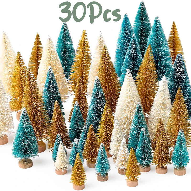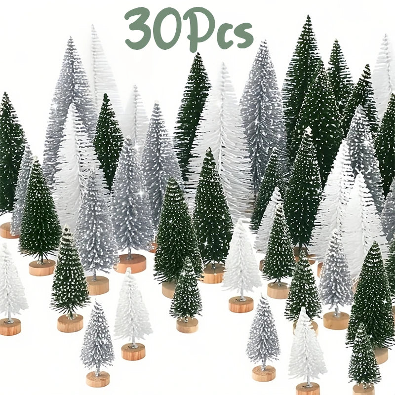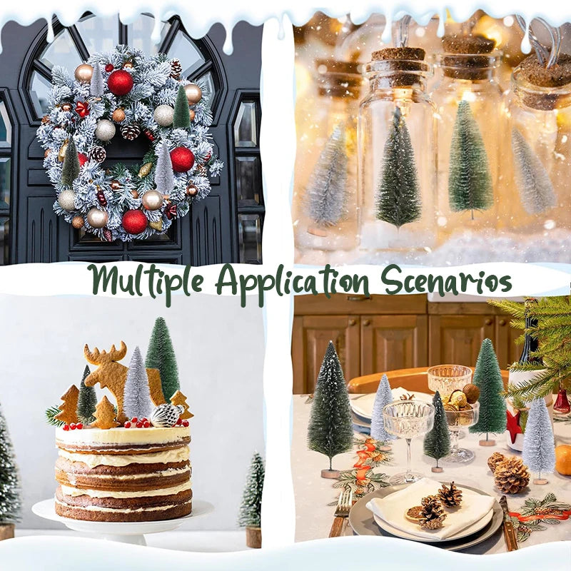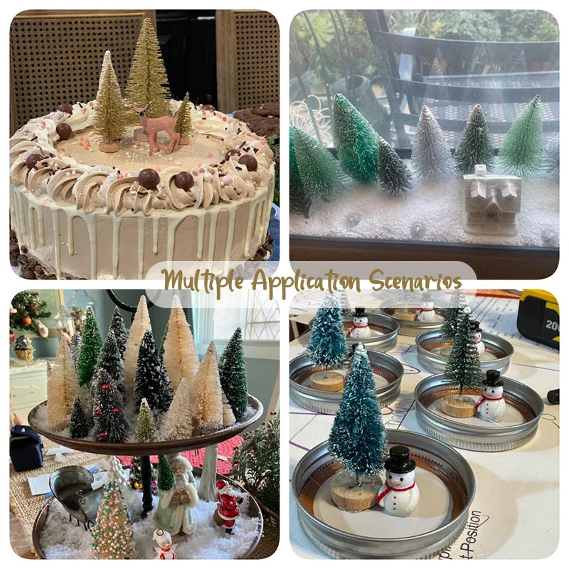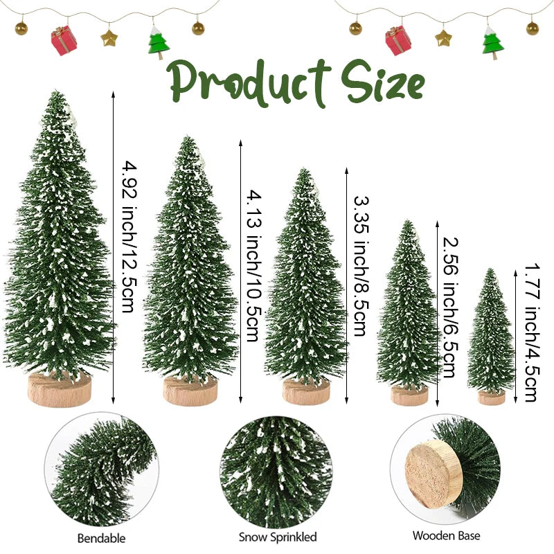 Create festive holiday scenes with this set of 30 mini bottle-brush Christmas trees. Each set includes five different sizes (1.77" to 4.92"), making them perfect for Christmas villages, table decorations, winter dioramas, cake toppers, craft projects, and seasonal displays. The snow-frosted finish and sturdy wooden bases add a realistic and charming touch to any holiday setup.
