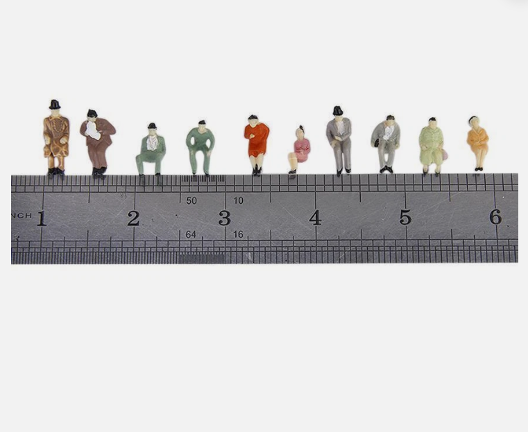 Add life and realism to your HO model railway with this set of 24 painted seated miniature people. Each figure features assorted outfits, colors, and poses, perfect for placing on benches, platforms, trams, buses, parks, cafés, and street layouts. These detailed figures instantly enhance any diorama, architectural model, or train scene.