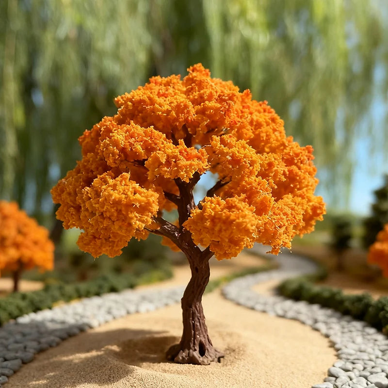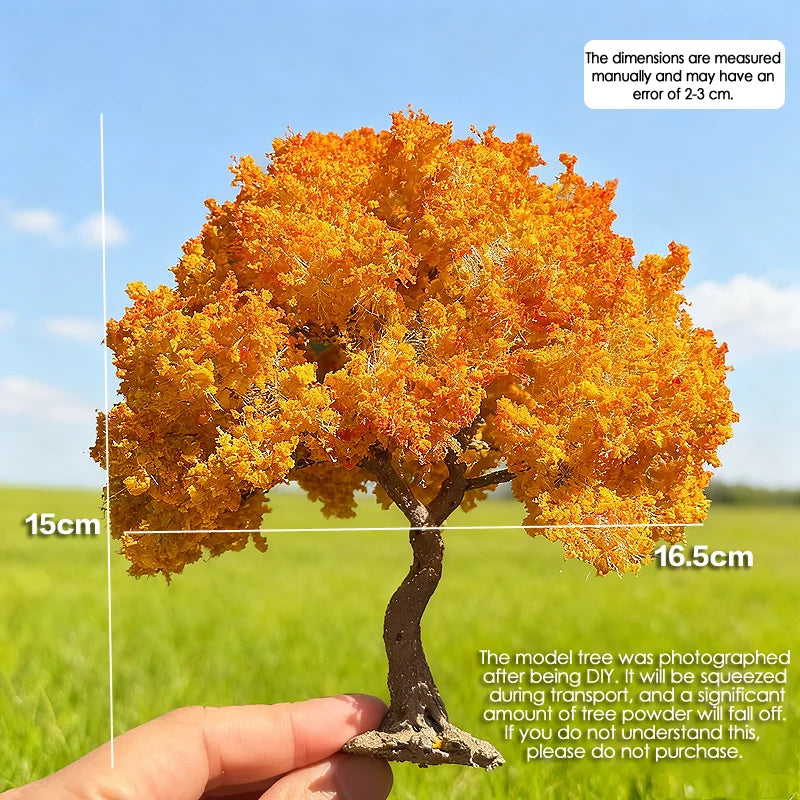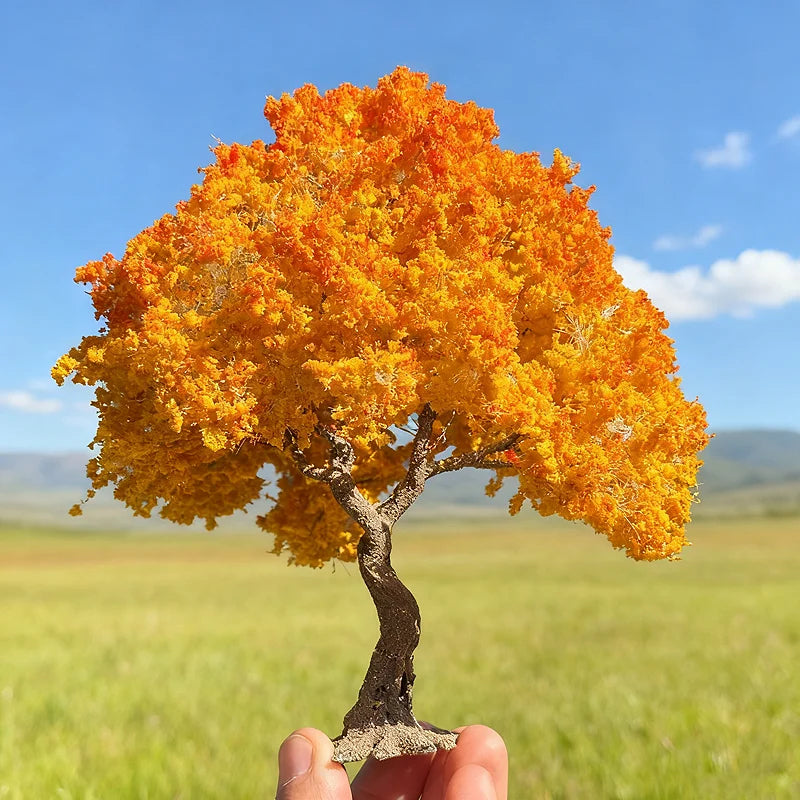 This miniature tree features a flexible wire trunk and detailed foliage in warm yellow-orange tones, perfect for model railways, sand tables, garden layouts, and school projects.
