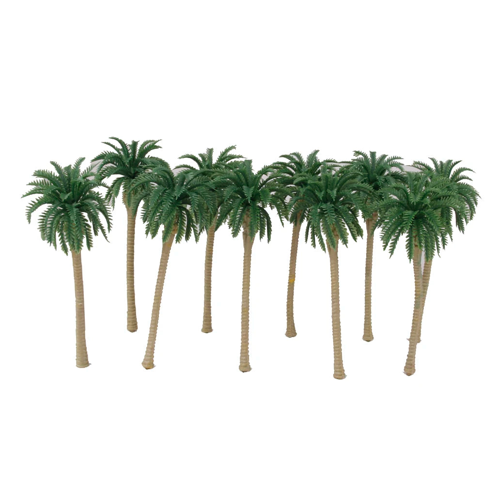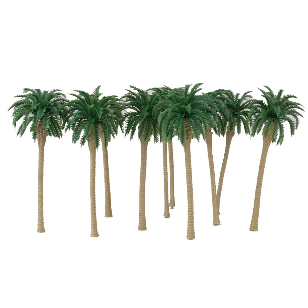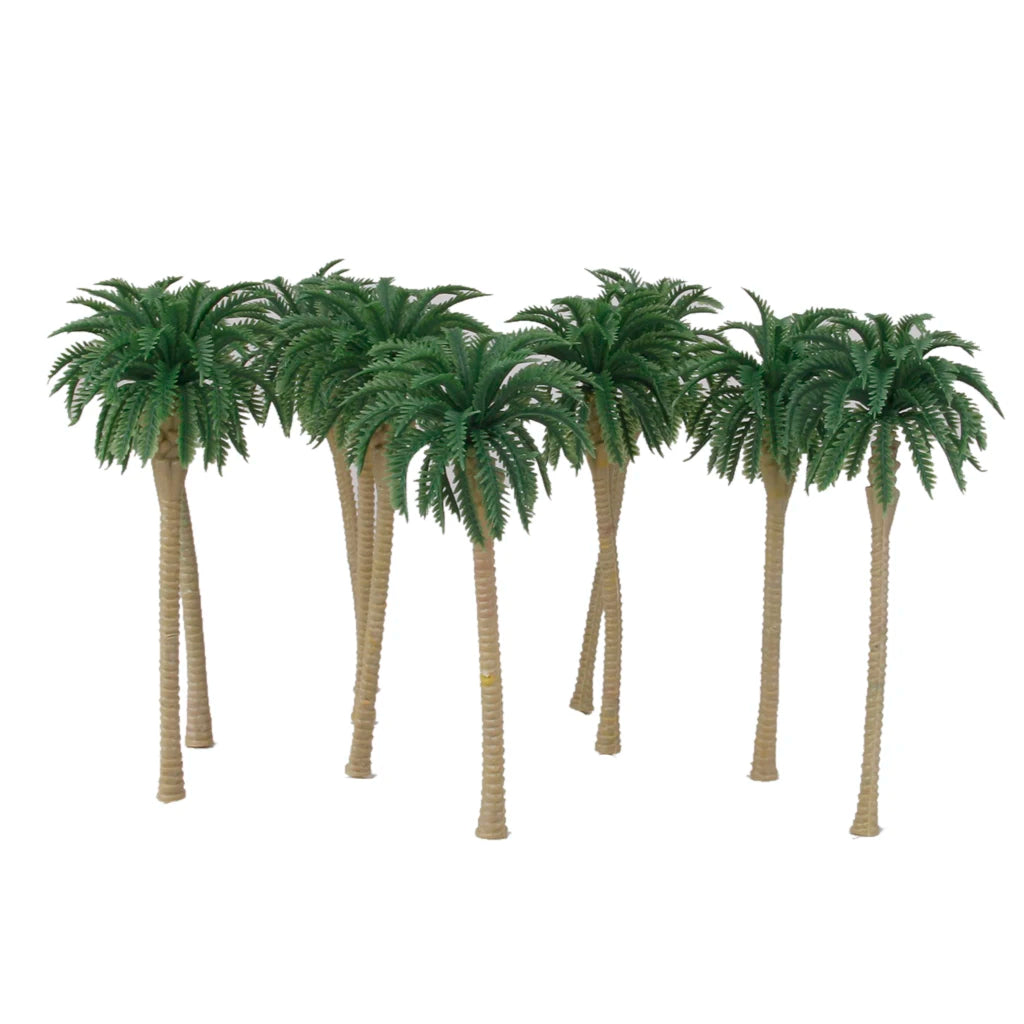 Create a realistic beach, island, or tropical battlefield scene with this set of 10 miniature palm trees. Perfect for railway layouts, architectural models, and tabletop wargaming environments.
